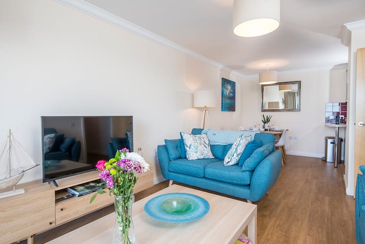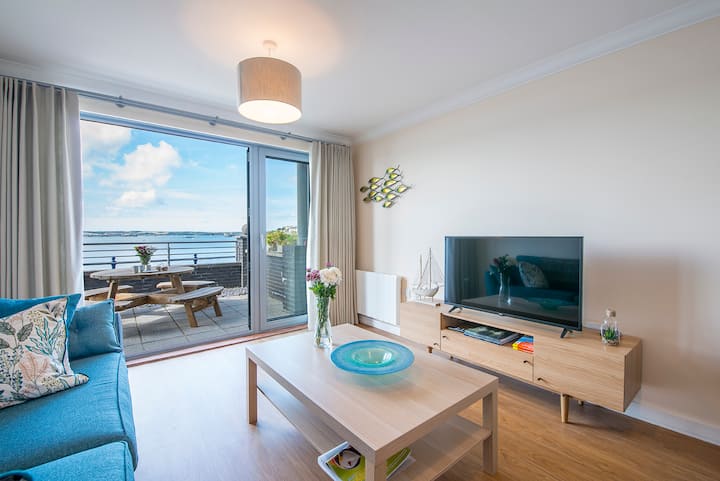 Shearwater is a stunning waterside ground floor apartment on Milford Waterfront. This luxury contemporary holiday home is beautifully furnished in tones to reflect the ever-changing waterway it overlooks, with locally produced Melin Tregwynt and Solva Woollen Mill touches and original local art. Set within a gated development, the communal hallway leads into your accommodation, the lovely light L-shaped living space with modern fitted kitchen, dining area and comfortable seating offers breathtaking views of the water, sliding doors open to your enclosed paved waterside terrace, where you can enjoy a morning coffee or a cool drink on a summer’s evening, relax and watch the gentle ebb and flow of the tide, with boats coming and going. The bedrooms, one ensuite are a heaven of calm each looking over the water, be lulled to sleep by the lapping water or wake to watch the sunlight sparkle on the water outside your door. Enjoy dining at home on your terrace, even purchase fresh fish landed on the quay by local fisherman or alternatively just yards from the door is a range of restaurants, cafes and boutique shops to explore. Milford Waterfront offers something for everyone, with galleries, a museum detailing the area’s maritime history, ten pin bowling as well as the Torch Theatre in the town centre only a short walk away. Ideal for sailing enthusiasts you can rent a mooring for your stay, the marina has been awarded 4 gold stars by the Yacht Harbour Association, keen walkers can explore heritage walking trails, or join the Pembrokeshire Coastal Path which skirts the edge of the Marina or take a Coastal bus 5 minutes from your door, so you can leave your car behind and enjoy a slower pace to life. There is a full calendar of events throughout the year including food festivals, fireworks and carnivals. Conveniently located to explore this stunning County with a range of beautiful beaches on the Dale Peninsula all within a short drive including Sandy Haven, Lindsway, West Dale, Musslewick, Marloes Sands and Martin’s Haven, this is the embarkation point for boat trips to the islands of Skomer and Grassholm, these trips are sure to be a highlight of any holiday and a real must to see the Puffins. Perfect for couples it makes a romantic retreat, where you can truly relax and enjoy all that Pembrokeshire has to offer. Due to safety and the nature of the building, no BBQs are permitted by the property management team on the patio.