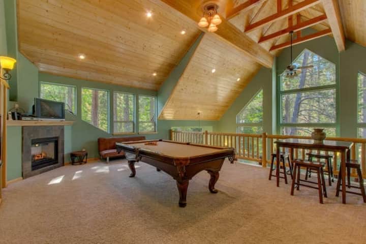 Enter this newly constructed 6 bedroom vacation rental in South Lake Tahoe, California and be mesmerized by the soaring 30ft cathedral ceilings complimented by tall picture windows seemingly inviting the forest into the Lodge. A large deck overlooks the forest which leads to the river where you can even go fishing. This home boasts of resort like amenities such as the large heated indoor salt water pool, cedar-lined sauna room, slate steam room, 6 person hot tub on a deck with a forest view, including an 8ft billiards table and large flat screen TV in the great room.