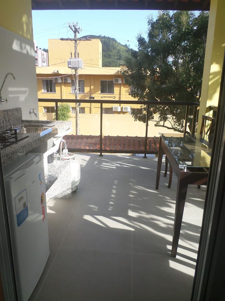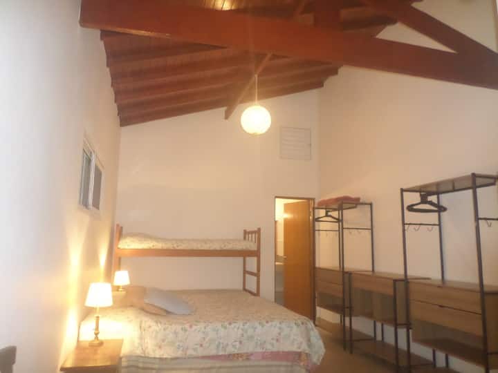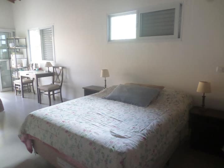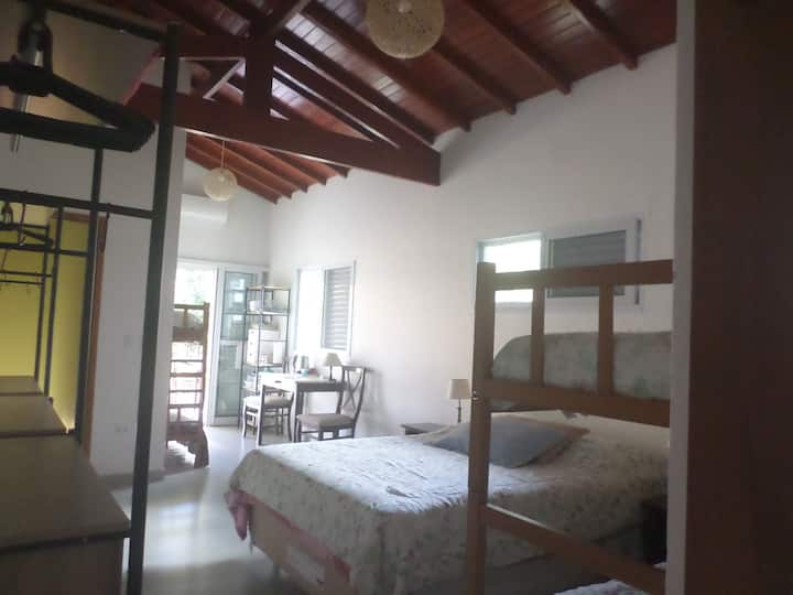 Harmonia Chalet Suite: spacious and airy, high ceiling with balcony and gourmet area/covered outdoor kitchen, 6-minute walk to Toninhas Beach (400m). Family atmosphere. Capacity for up to 6 people (2 bunk beds and 1 standard double bed). It has air-conditioning, a mosquito net, and a desk for a home office. Closets, compact and complete equipped kitchen, washing machine, clothesline and hammock. Bathroom with double vanity. Bus stop, restaurants and markets nearby.