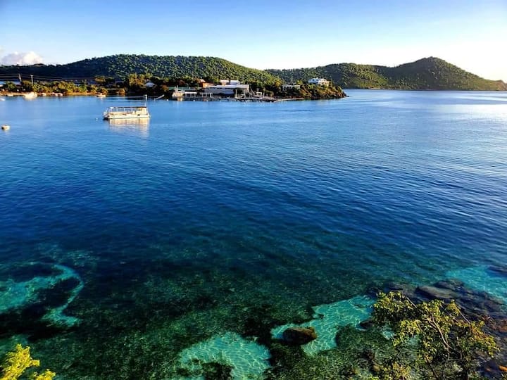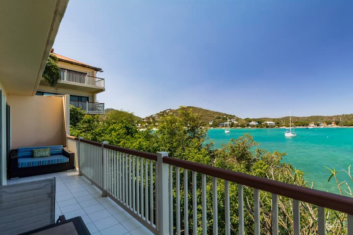 This newly renovated romance ocean view suite with free 100mb Wifi is located just steps away from Sugar Beach. A very private, beautifully decorated, near water level suite offering all the amenities of home with great views of Water Bay. This villa features a large wrap around balcony with three sets of sliding glass doors leading out to it from the bedroom as well as the living area. The combined living areas feature a king size bed, a single hideaway bed, two readings chairs, a sofa, USB charging port, a wall mounted flat screen TV, and an indoor dining table with seating for two. A fully equipped kitchen includes a refrigerator, a convection microwave, coffee maker, toaster, stove, a blender, and all the basic cookware needed to prepare a lovely meal. The outdoor balcony has a dining table for two for enjoying the beautiful views while dining. This villa is close to Sugar Beach and the Waterfront Pool. The hilltop pool is located at the hilltop of the resort. Parking is located near the entrance of the building and the suite requires a few steps down to enter.