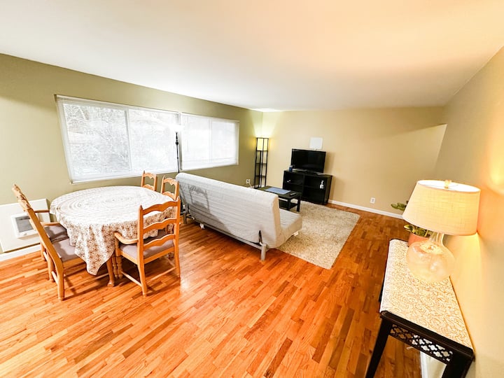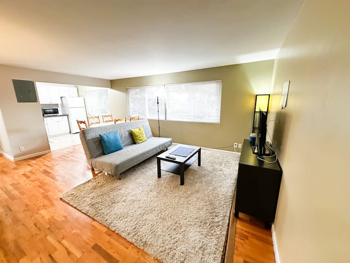 This furnished large two bedroom apt is on the 2nd floor in the eight-unit apartment complex with a serene courtyard, located in a quiet neighborhood of the famous University Village. Restaurants, banks, and shopping center, buslines are within 5 minutes walking distance. Easy access to I-5. 10 min to get to down town normally; 20+min in rush hour.