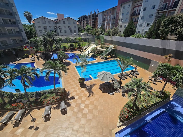 The Flat at Veredas Rio Quente is very well equipped to facilitate your days of rest and fun, and is very well located, 400 meters from Hot Park, close to restaurants, markets, bakeries and pharmacies. Veredas has several amenities, including cold and heated swimming pools, 1 indoor pool, sauna, 2 Jacuzzis, fitness center, squash and soccer courts, children's space, game room, restaurant, snack bar, restaurant, work space and free private parking for 1 car.