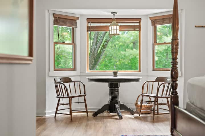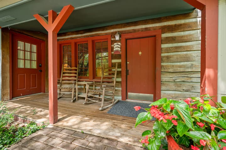 Cozy 1885 log cabin with an AMAZING view! Abe’s Cabin is set atop one of the highest hills in Brown County. With a jetted spa tub, gas fireplace (seasonal), an absolutely adorable farm kitchen, this little cabin is a charming spot for a couple or small group to unwind. King bed downstairs, and a queen bed in the loft. A front porch with two rocking chairs, and back deck with a table and chairs, plus grill.