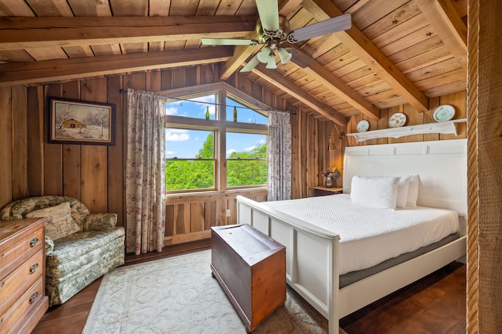 The upstairs loft bedroom is cozy and has large windows overlooking the best view in Brown County, a small closet, and overstuffed chair.