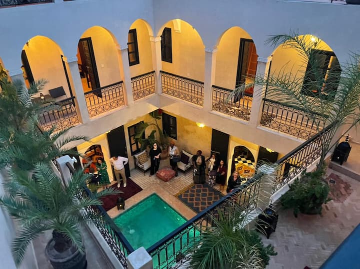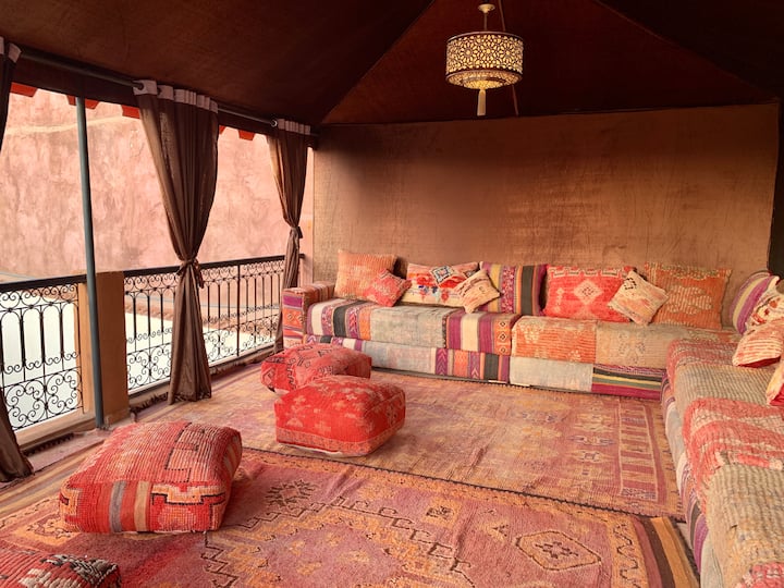 A quiet Riad in the heart of the Mechouar al Kasbah, inside the gate of Bab Agnaou, a vibrant area in the old Medina. A short walk from the main road, the riad is in a quiet neighborhood that is close to shops, restaurants, historical sites, and 12 minutes to the main square. 5 en suite bedrooms, a terrace, salon, dining room & pool. We offer day- & longer-trips around Morocco. Ask us & we can plan a customized holiday for you. Also, let us know if you're celebrating something special.