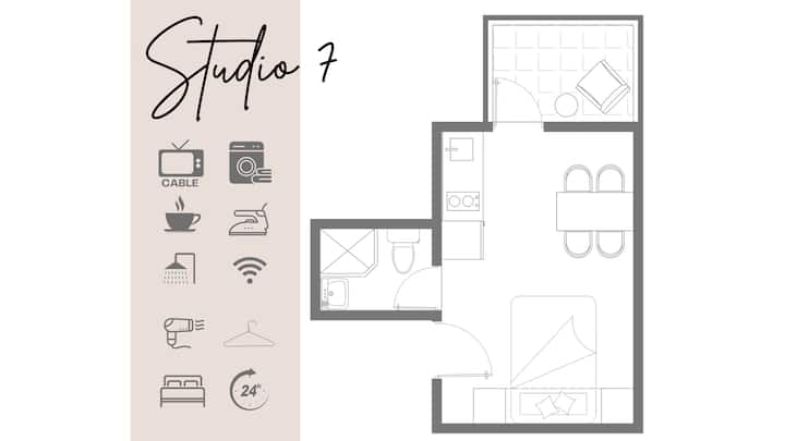 This studio apartment of 25 sq meters is fully equipped with a double bed (140 x 190 cm), sofa bed and plenty of storage space. Amenities include an iron, hairdryer, dining area, full kitchen(frying pan, pot, cutlery and everything you may need for cooking as well as coffee, oil, salt, etc.), bathroom with shower (hot water), fan and smart-TV with Roku and cable. A small private courtyard is also available for relaxing. Take advantage of the free shared laundry facilities. Entrance is facilitated by an electronic lock. Book now for an exceptional and comfortable living experience. Don't miss this unique opportunity!