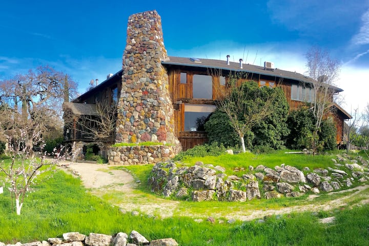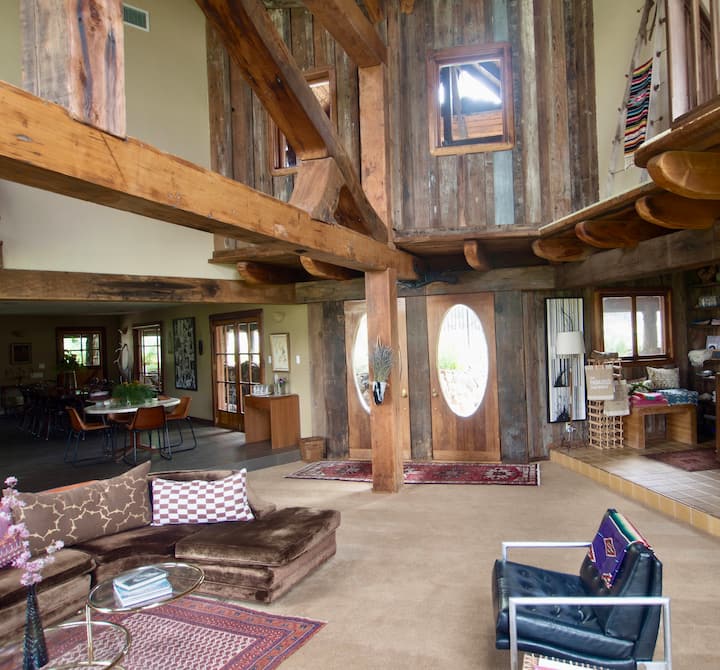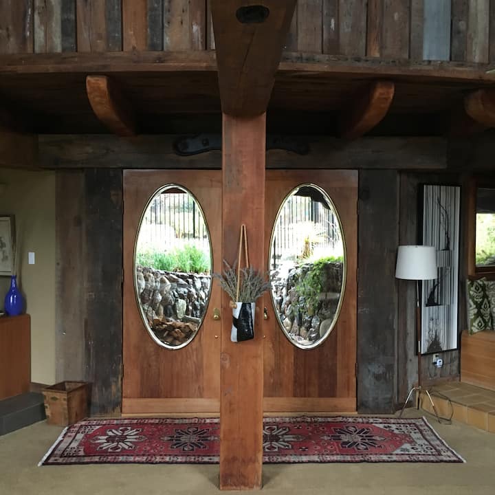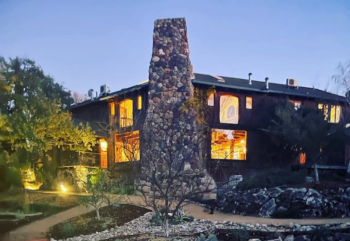 The Big-Sur-esque Lodge at Inn Paradiso is handcrafted of old growth redwood and hand-forged metal. It has rustic elegance coupled with modern eclectic design. It is an art and book filled home with a massive stone fireplace, soaring ceilings, and expansive picture windows. It is well-appointed with mid-century furniture, antiques, and art. There are 3 private suites each with separate entrances, fireplaces, and spa tubs. Perfect for friends, families, and couples to escape the demands of life.