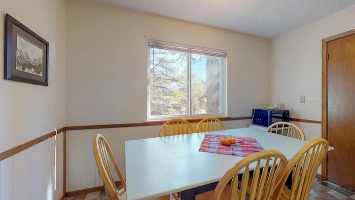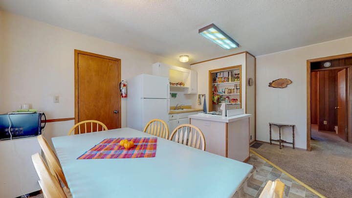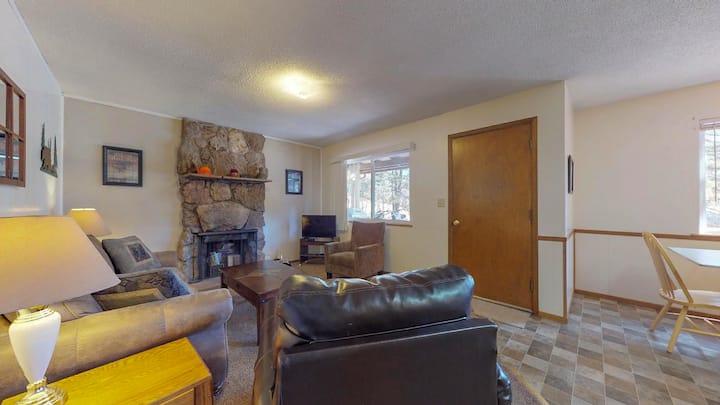 This spacious cabin is part of a duplex, invites up to eight guests. With a Queen bed and a double bed and 2 twin beds in the other room along with a double-sized sleeper sofa. The wood-burning fireplace sets the stage for cozy evenings, creating a warm ambiance that complements the comfort of the cabin. A fully stocked kitchen, just bring your own food, coffee, and condiments/spices, and let this become your hub for shared moments. The bathroom has a tub/shower combination and a separate vanity