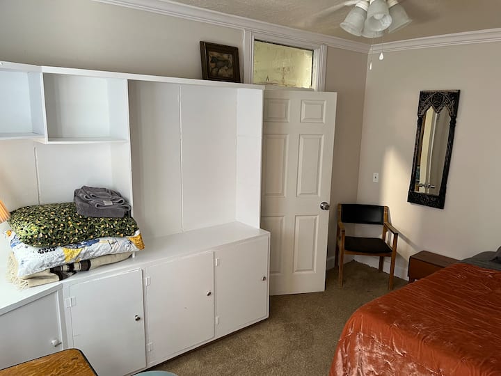 This room is located on the lower level of an 1894 residential home in a quiet neighborhood. Sleep soundly on the very comfortable queen-sized mattress & enjoy the plush pillow and high-quality linens.