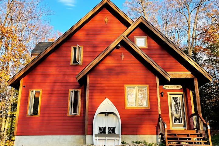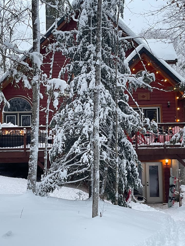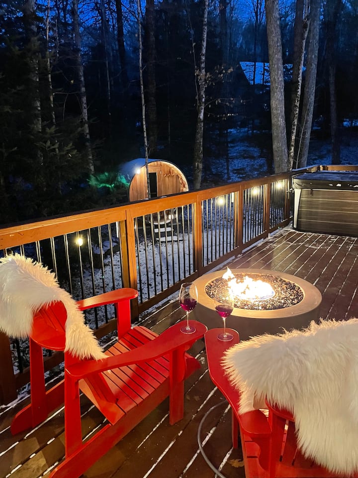 Escape to a luxury 3-level chalet with ski-in/out, access direct from the basement level, at Sir Sam’s. This secluded forest retreat blends rustic charm with upscale comfort. Après-ski by the fire or unwind in the private hot tub and sauna for a true spa experience. Take in stunning views, explore scenic trails, or stroll to the beach just 2 mins away. Close to Haliburton Wolf Centre, Algonquin Park & more. Perfect for couples, families, or anyone seeking a refined, all-season escape in nature.