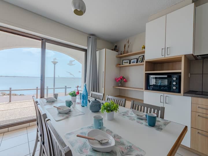 3-room apartment 60 m2, on the ground floor, south-west facing position. Living/dining room 20 m2 with TV (flat screen). Exit to the terrace. 1 room with 2 beds (80 cm), 1 x 2 bunk beds (80 cm). 1 room with 1 french bed (1 x 180 cm, length 200 cm). Kitchenette (4 hot plates, oven, dishwasher, microwave, freezer, electric coffee machine).