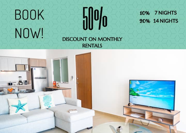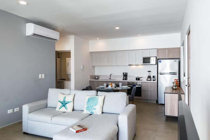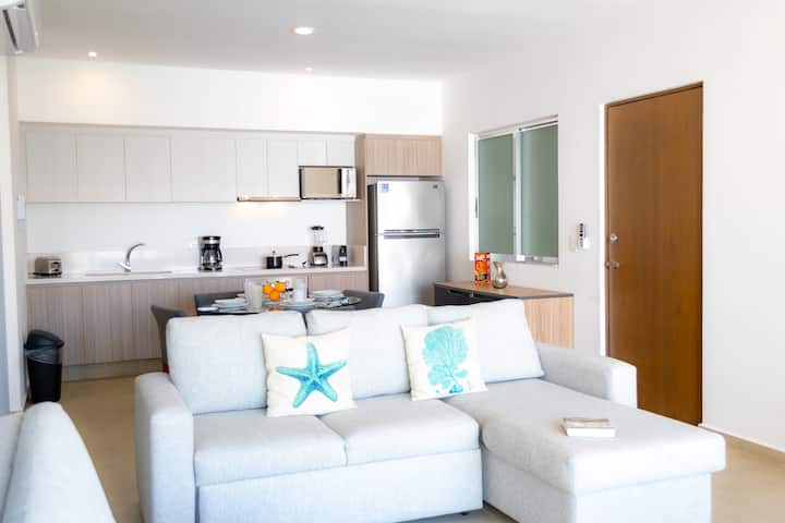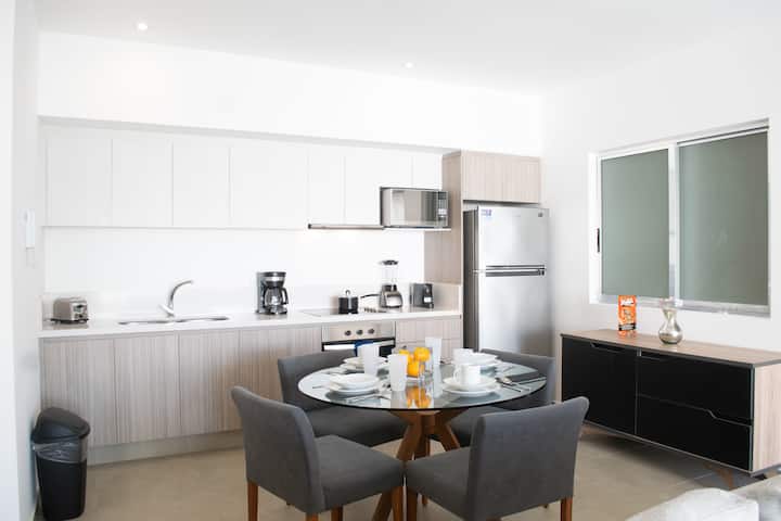 Spacious, modern and fully equipped one bedroom condo located in the best area of Playa del Carmen downtown area just one block from 5th. Avenue and 2 block from the beach. close to restaurants, supermarkets and bars.