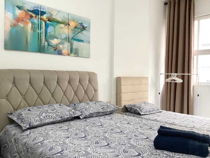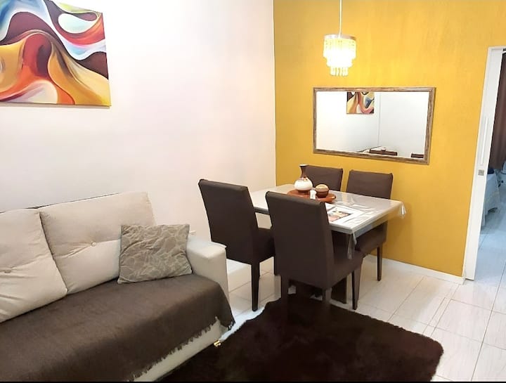 Family environment, quiet and clean. Polite and helpful 24-hour doormen. It can accommodate up to 4 people. It has 1 queen bed with a 40 density mattress that supports weights above 100 kg, 1 single bed, 1 double sofa bed, dining table with 4 seats, pots, cutlery, plates, refrigerator with freezer, 4-burner stove with gas oven, wardrobe, clothes rack, clothesline, bed linen (bedspreads on double and single beds, 1 double sheet, 1 single sheet, 3 blankets and 3 pillows. In the wardrobe to be used in the sofa bed: 1 sheet, 1 blanket and 1 pillow), 4 towels, washing machine, microwave, coffee maker, sandwich maker, blender, hair dryer, electric shower, iron and ironing board, 3 ceiling fans, air conditioning, 2 TVs, one 32-inch and the other 40-inch (living room and bedroom, respectively) with Claro TV, as well as Wi-Fi.
