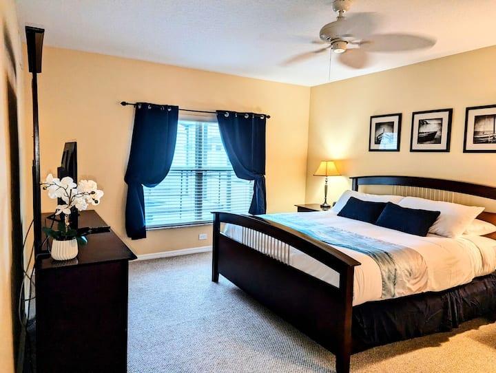 On the ground floor is the main master bedroom with private ensuite with a garden tub, separate shower and dual vanity. The bedroom offers a comfortable king size bed and 43" TV to wind down after a long day at the parks or under the sun. There is also another bedroom on the first floor with a Queen size bed. Additionally you will find a bathroom with shower.
