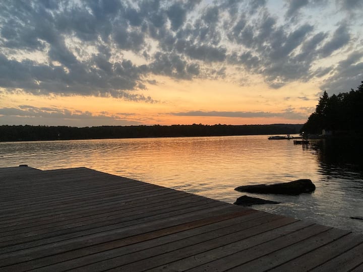 Welcome to Algonquin Delight, serene 4 bedroom waterfront retreat on Kushog Lake, Algonquin. This is the quintessential family cottage experience! Panoramic lakeviews, BBQ, game room + kids' bunk. In summer we offer kayaks, canoe, paddle board, pedal boat. Clean, sandy bottom, shallow entry for kids. In Fall, we are close to plenty of trails, ATVing and more. Roast marshmallows by the fire pit. Magical sunsets by the lake + incredible stargazing right from your backyard. Sleeps 8. Starlink WIFI