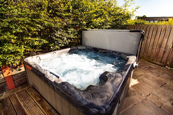 The paved patio features comfortable outdoor seating under a large parasol — perfect for alfresco dining or simply unwinding with a glass of wine as the children enjoy the spacious lawn nearby. And just when you thought it couldn’t get better, there’s the highlight of the property: your very own private hot tub. Sink into the bubbles and truly switch off from the hustle and bustle of everyday life.