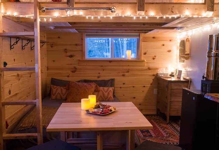 NOTE: The 180-square foot cabin and hot tub comfortably fits 2 adults or a family of 3-4 (kids ages 6-12). This is a "tiny living" meets "elevated glamping" experience!