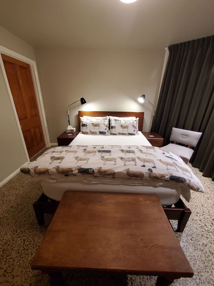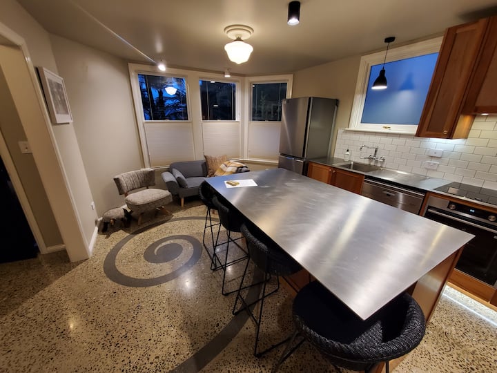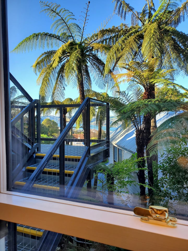 Designed by owner-architect Valeri, Koru Flat is a well-appointed modern apartment that retains hints of the tradition embodied in the century-old historic villa above. Conceived as an urban in-fill project while upgrading the foundation of the original house, the nature of the site (a steep hillside overlooking the city) is such that large windows bring in natural light and provide views over the city, harbour, and peninsula through the canopy of Dunedin's most outstanding grove of mamaku trees ("black fern," or giant tree fern). Just outside your front door you'll find a steel staircase (constructed as part of the 2023 renovation project) that climbs to the villa where owners Valeri and Trent live (see photos). Guests are welcome to make use of the stair platform to admire the view or sip a drink while enjoying the unique atmosphere of a mature mamaku forest canopy.