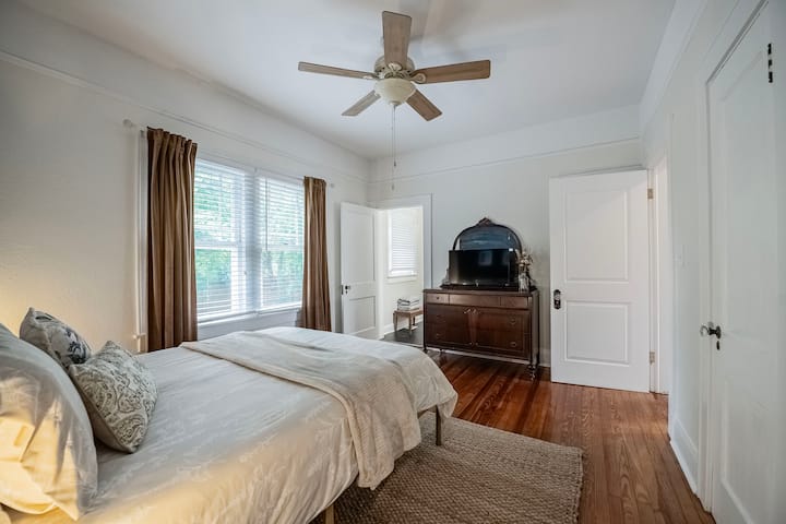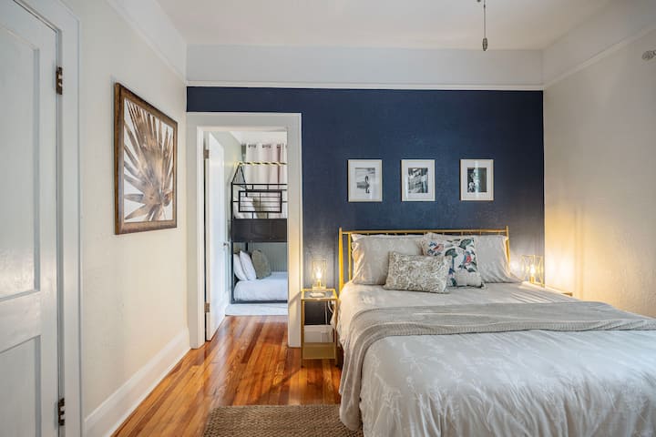 "The Belmar Bungalow" is a charming over 100 years old Historic Home nestled in the heart of the Downtown Lakeland Historic District. The bungalow features stylishly designed bedrooms that have been fully remodeled to offer modern comforts while retaining the character of the original architecture. With sleeping arrangements for up to 6 guests, it's perfect for families or groups of friends looking to experience Lakeland in a comfortable and homely setting. Walking distance to Lake Hollingsworth