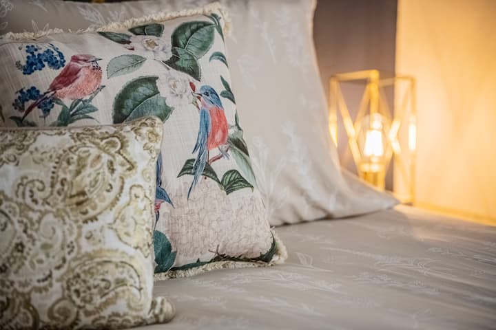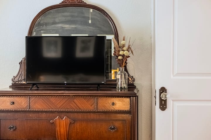 This Boho Chic bedroom comes with a queen sized bed with soft linens and Roku Smart TV. It has a large closet and storage space for extended stays. It has black-out curtains, which make it great for sleeping in.