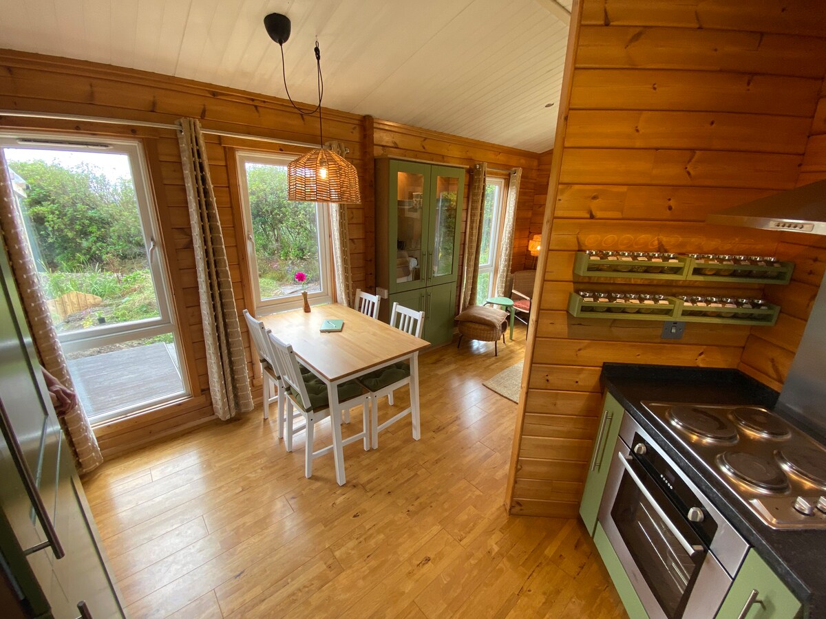 Breakfast basket included. The cosy cabin features one double and one single bedroom, seperate fully equipped kitchen with Nespresso coffee machine, lounge with sofa, Smart TV with HDMI, Fibre broadband, gas stove and dining table, bathroom with hand basin, toilet and shower. The cabin has double glazed windows with central heating, patio doors opening to south facing veranda with patio furniture and private car park. Quiet surrondings with views of the mountains. Very functional and homely.