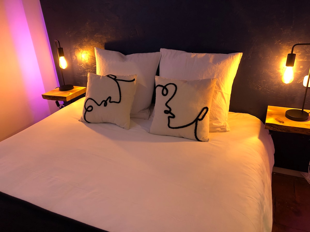Out of sight, at the end of a cul-de-sac, this place welcomes you to spend a few hours, a night or a weekend with your partner in a space with a unique and sensual decor. Bruno and Émilie will personalize your stay so that you can fully enjoy this break. Your arrival can be completely autonomous if you wish, with flexible arrival and departure times, in the middle of the day, in the evening or in the morning.