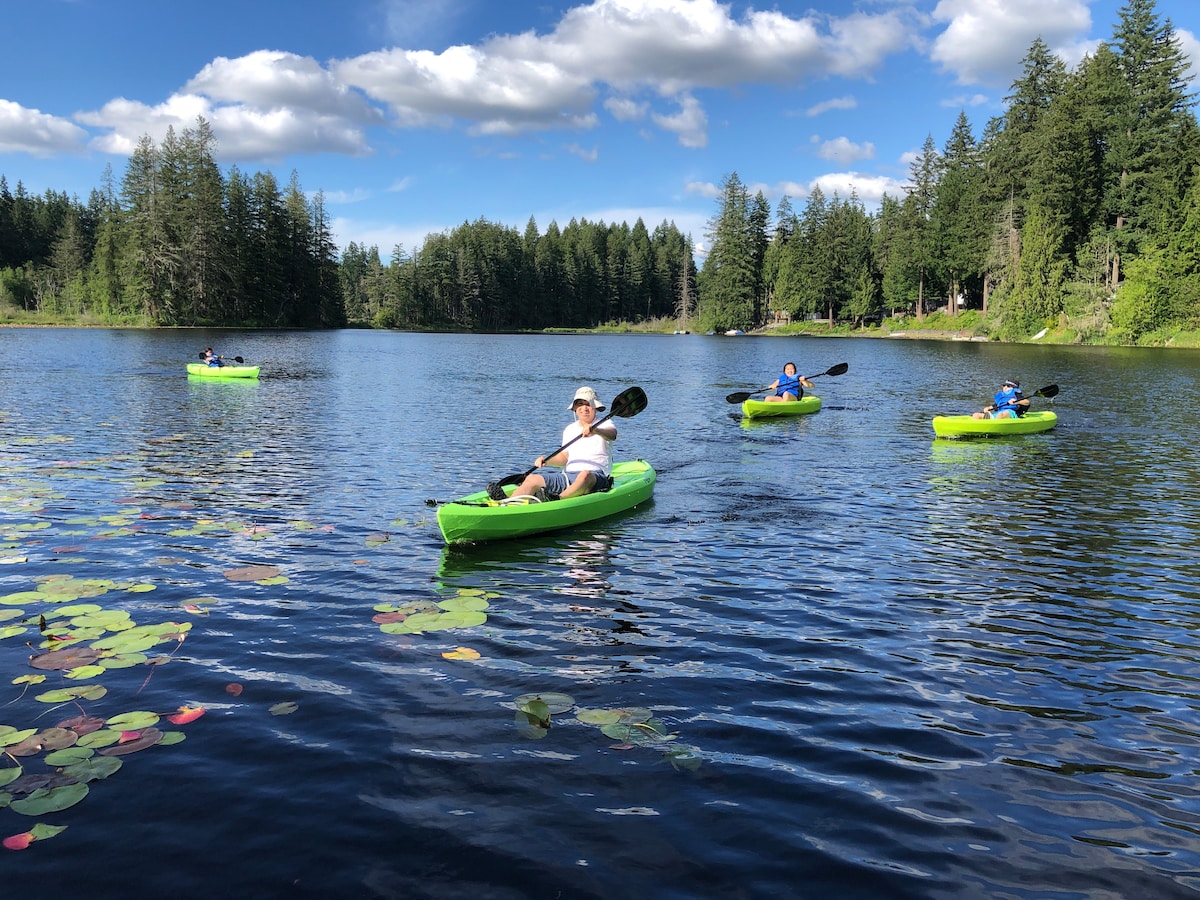 Perched over Whitman Lake, escape with a cold beverage on your large deck that makes you feel "within the trees." Surrounded by old growth cedars, watch as the resident bald eagles take turns diving into the lake for their lunchtime snack. Walk down the railroad tie stairs and through our "naturally" landscaped yard to find your private dock with a kayak that is free for guests. Whitman Lake is just ~45 min south of Tacoma and ~45 min north of MRNP... a perfect home base for your adventures.