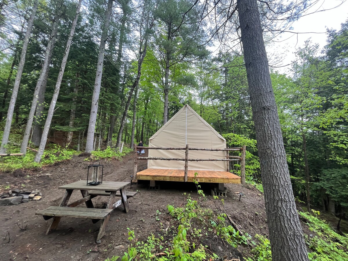 We are offering a beautiful, COMFORTABLE, option to camping. Our off grid tent comes with all the comforts of home including a wood stove and reading nook! It is nestled into a hemlock grove overlooking the active beaver pond. Walking trails and local activities at a stones throw. If you have a small boat or kayaks- BRING them! We have space in the yard and lots of local places to send you to get good use out of them. Please do not use on our pond. We have a boat available for use.