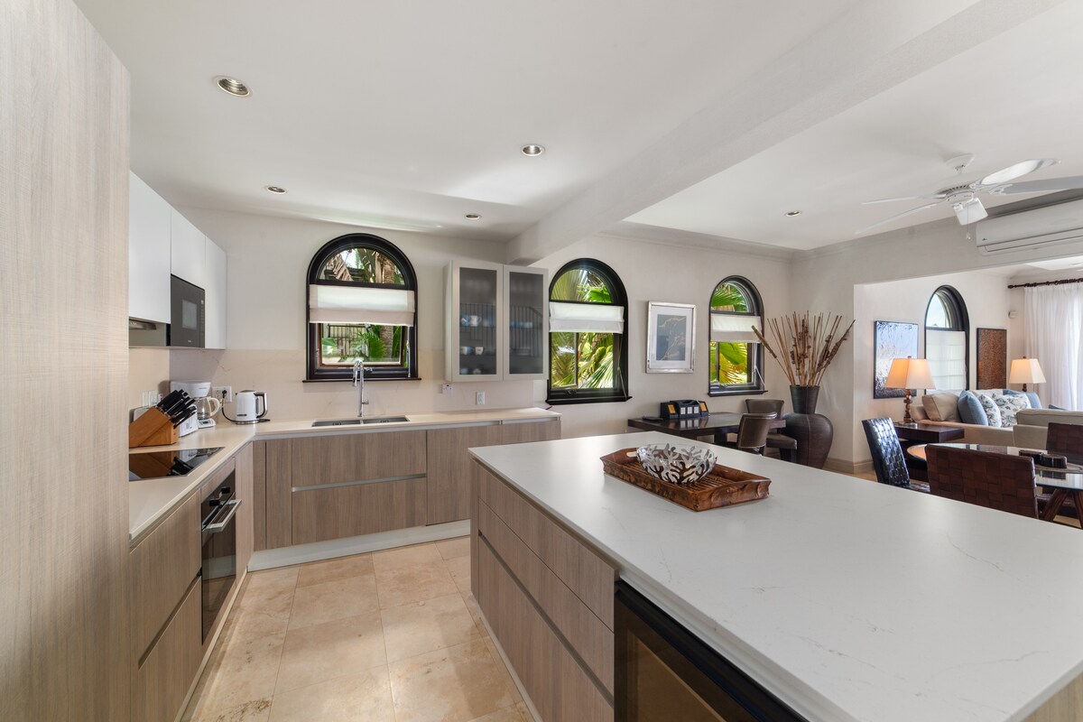 Relax in the cozy yet sophisticated living area, complete with plush seating, air-conditioning, and a flat-screen TV, ideal for unwinding after a day of island adventure. The elegant dining space comfortably seats six, perfect for enjoying home-cooked meals or gourmet creations by a private chef. The modern kitchen is fully equipped with high-end appliances and sleek countertops to meet all your culinary needs.