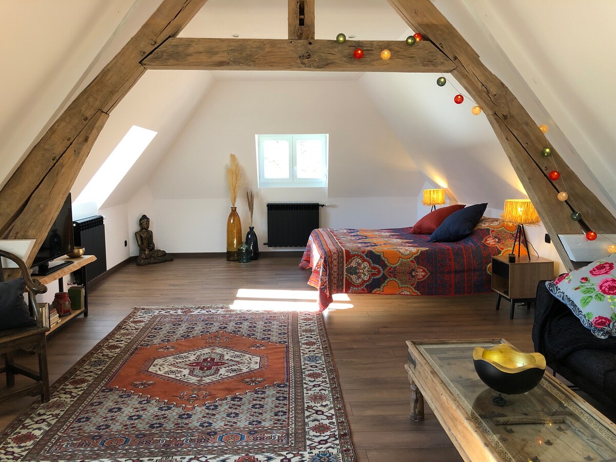 Beautiful duplex apartment with independent entrance. Including equipped kitchen with oven dishwasher, microwave oven, toilet shower room, upstairs a large atypical living room including living room and bedroom, toilet . Sleeping a queen bed in the bedroom (bed 180*200).In the living room a sofa bed Ideally located in a village close to a historic site (Château d 'Harcourt, Château du champ de bataille le Neubourg, Bernay,Brionne.Beaumont le Roger.