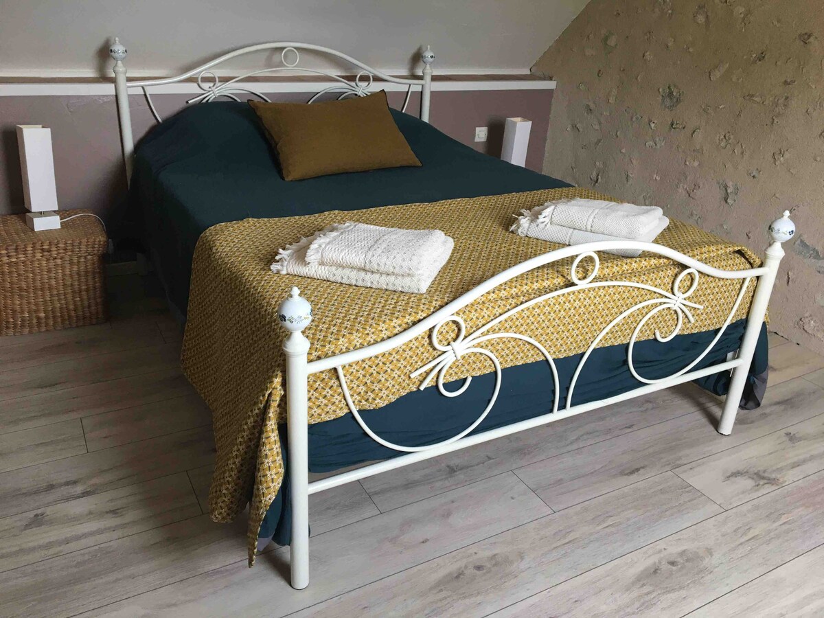 Belle pièce à vivre claire et au calme située dans notre propriété avec petite terrasse sur le devant pour profiter de l 'extérieur. Cuisine équipée, lit de 140*190 draps fournis,serviettes de toilette, torchons, produits ménagers et possibilité d 'ajouter un lit parapluie ou d 'un lit pliant. TV et Wifi.