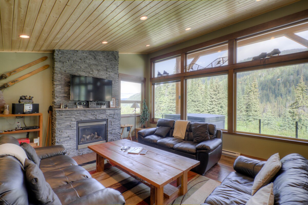 Twin Oaks is a beautiful timber-framed chalet with easy access to ski-in. From the moment you pull in the driveway you'll notice the exceptional design and superb craftsmanship of this stunning home, and it simply gets better when you get inside! From the kitchen, dining area or living room, you've got a fantastic view of the Burfield runs on Mt. Tod across the way. Around the back of the house is your private hot tub and barbeque.