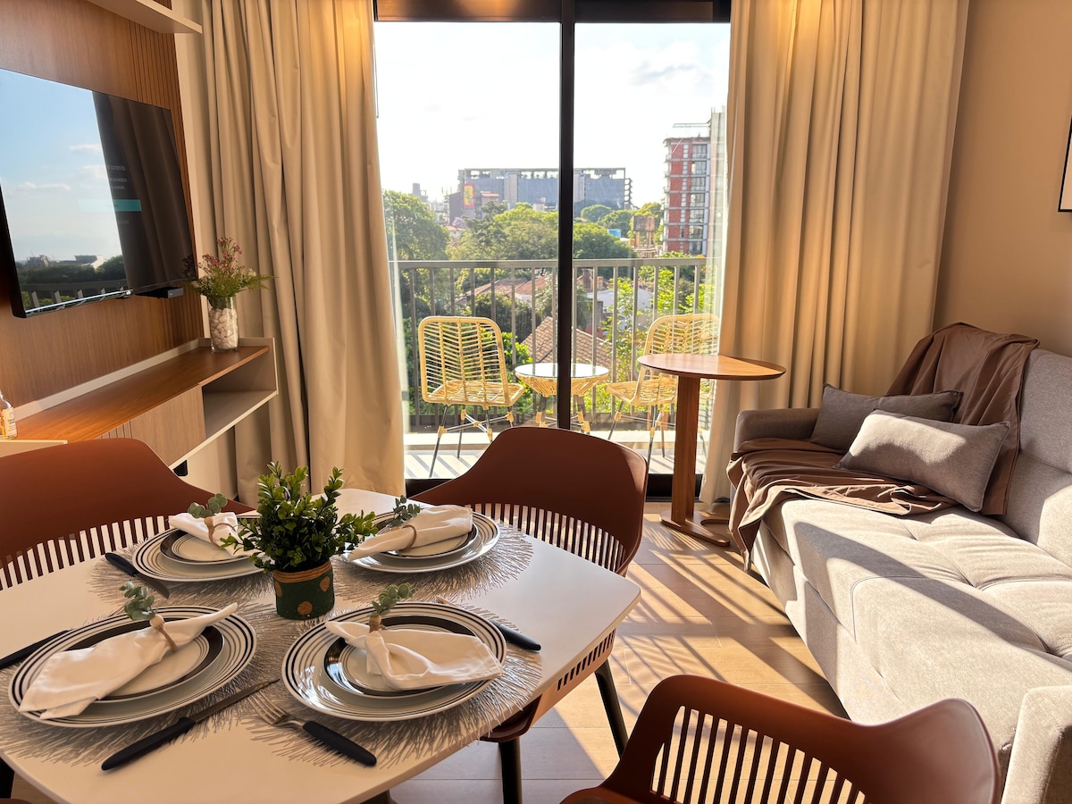 Modern and bright one-bedroom apartment, located a few blocks from Shopping del Sol and Paseo La Galería. 10 minutes from the airport. Enjoy a carefully-decorated space with an open-plan living room, a kitchen equipped with high-end appliances, and a balcony with city views. The bedroom features a queen-size bed, warm lighting, and air conditioning throughout the entire unit. Perfect for short or long stays, with easy access to major shopping centers and restaurants.