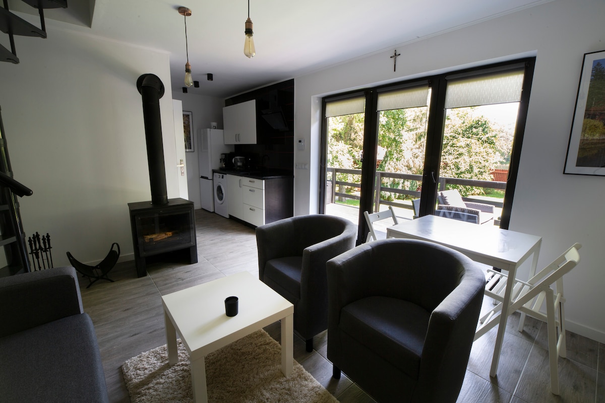 Comfortable cottage opened in June 2021, located in a charming, quiet place, surrounded by a forest. There is a large garden with two ponds at the private disposal of guests. A garden grill/ fireplace are available. Distance to the nearest buildings is ap.100 m. WHAT MAKES US SPECIAL? One house on a large plot, lovely quiet place, no close neighbors, hot tube, high-quality furniture /equipment. If you don't like relaxing in the crowd - our house is just for you!