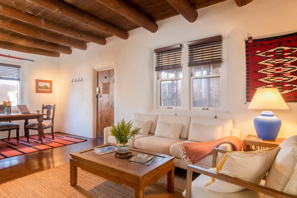 Our charming historic classic adobe casita is an easy ten minute walk to the Santa Fe Plaza, dining, and museums. We offer private off street parking for two vehicles. The interior features classic Santa Fe style wood beam Viga ceilings, kiva fireplace stocked with wood, skylights, a full kitchen living area, private bedroom, soaking tub, modern appliances, washer & dryer, swamp cooler, WIFI, flat-screen TV, a lovely enclosed courtyard with mature trees and BBQ. Dogs are welcome.