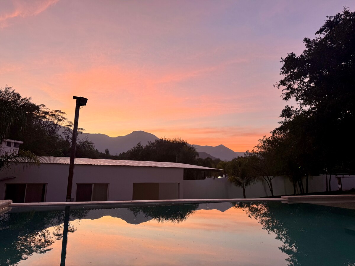 La Casita del Encino is a very wooded place with a beautiful pool, just 15 minutes from Monterrey, 6 minutes from the main square of Santiago, Nuevo LeĂłn, and 10 minutes from the Presa de la Boca. A place to meet and enjoy yourself. Connect to life through these long-lived trees. We can grant a special offer for stays of 2 nights or more. Just ask.