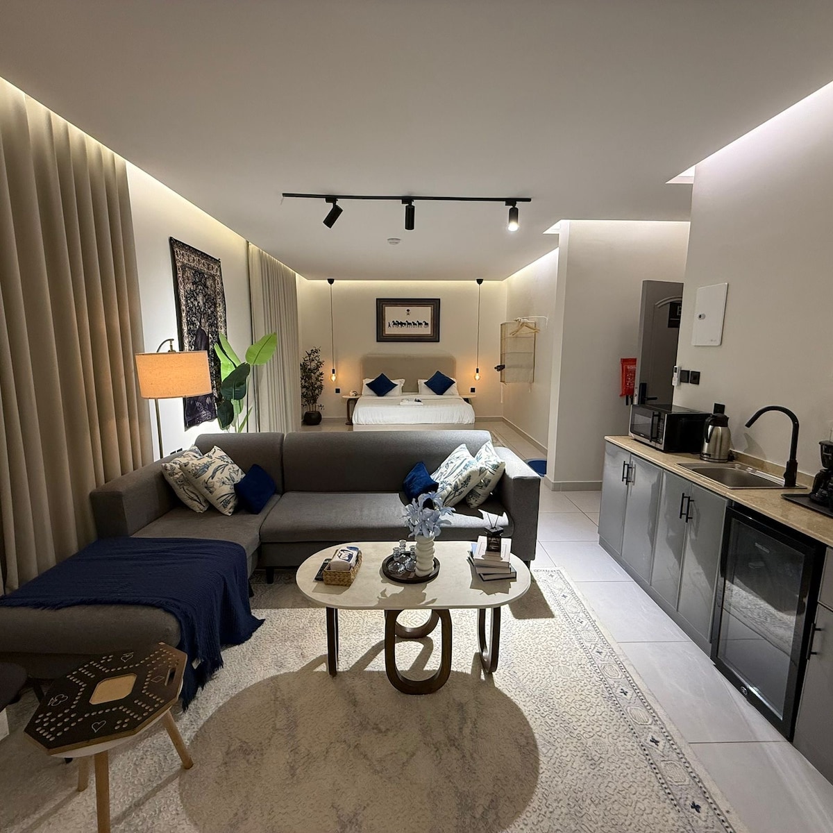 * * Premium Location 📍* * The apartment is located in a luxury residential complex, Close to a supermarket, a laundry, and a sports walkway. It is only 5 minutes from the Bahrain Bridge🇧🇭. **Comfortable and modern studio apartment with smart entry system (Self Check-in) 🔑** **Features:** - Newly furnished with classic furniture. - Equipped with an Internet connection🛜 ⚡. - Includes an integrated service corner (refrigerator, stove, microwave, kettle, and espresso machine☕️. - **Facilities:** - Has green spaces, a swimming pool (Swimming hours: 9:00 am to 6:00 pm)🌞. Enjoy a comfortable and special stay!