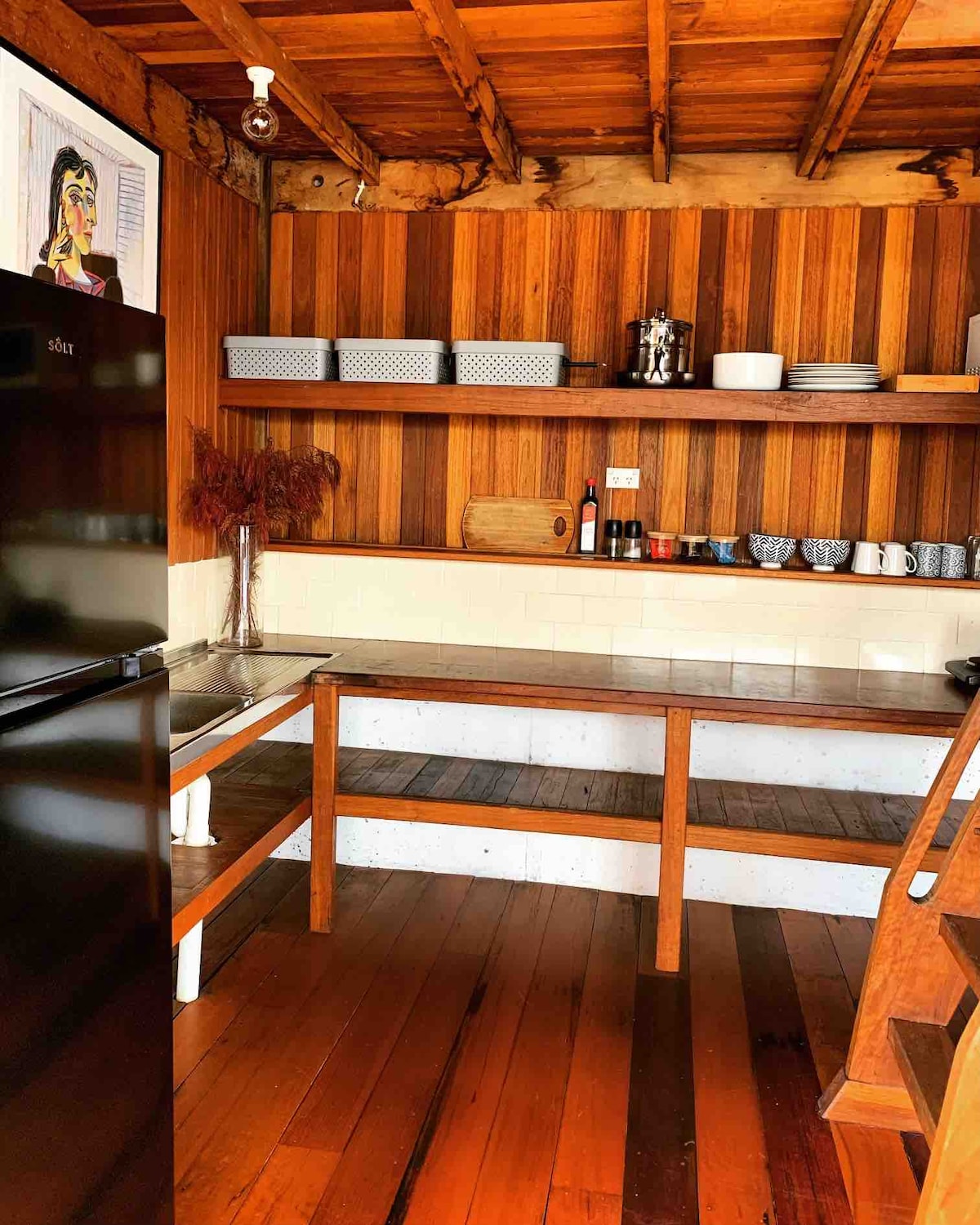 This Red Cedar & Rosewood Cabin is perfect for a couple, it is self contained with a kitchenette, seperate bathroom with toilet/shower/basin & a king size bed. PLEASE NOTE it's priced for 2 Guests, there is an option of the double bed in the loft upstairs free of charge for an extra 2 guests. This rustic cabin has a shared entrance to the house below. However it is completely free standing with its own courtyard & BBQ. Located at the top of Scotts Head with a surf check just across the road.