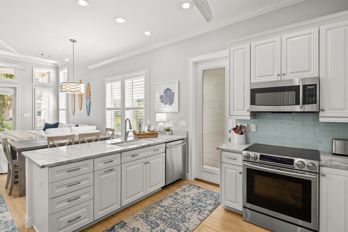 Steps from the beach, The Seagrove Studio is the perfect place for a family holiday, romantic getaway, or remote work. Neighbored by an organic cafe, local-favorite restaurants, and a fresh seafood market, the modernized space includes luxurious linens, a well-equipped kitchen, dedicated workspace, Samsung Frame smart TV, Nespresso machine, and beach chairs. Enjoy your morning coffee in an Adirondack chair on the private patio or take the short walk across the street to the world-class beach 🏖.