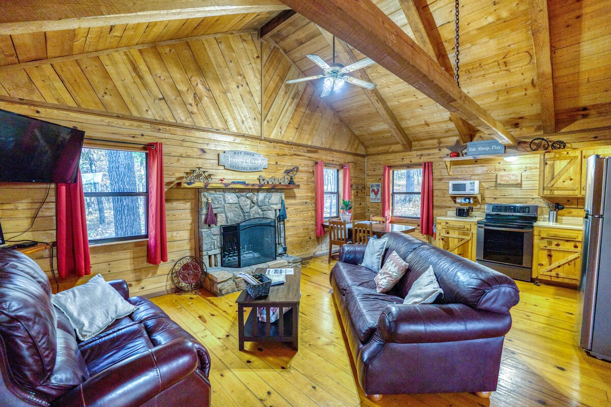 Welcome to your peaceful Ozark retreat - a cozy cabin tucked among wooded acres with mountain views and space to unwind year-round. - Sleeps 4 | 1 bedroom | 3 beds | 1 bath - Private hot tub - seasonal Mar to Dec, open 24 hrs - Mountain view, fire pit & private patio or balcony - Indoor fireplace - electric & 55 inch HDTV - Kitchen, dining table, free washer & dryer - In unit - Pet-friendly & free driveway parking - 8 spaces w/ EV charger