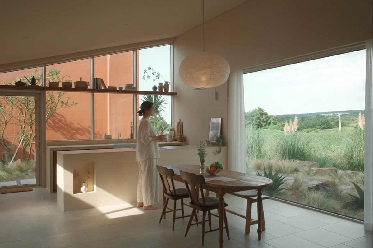 Le Village Aewol, located on Aewol Coastal Road, is a stunning accommodation where you can enjoy breathtaking ocean views and sunsets from every room. It is conveniently situated just 20 minutes from Jeju Airport. Opened in August 2023, the interior is inspired by Cuban resort vibes, and the 6.5-meter high ceiling combined with large ocean-view windows makes it feel like you're right by the seaside even while indoors.