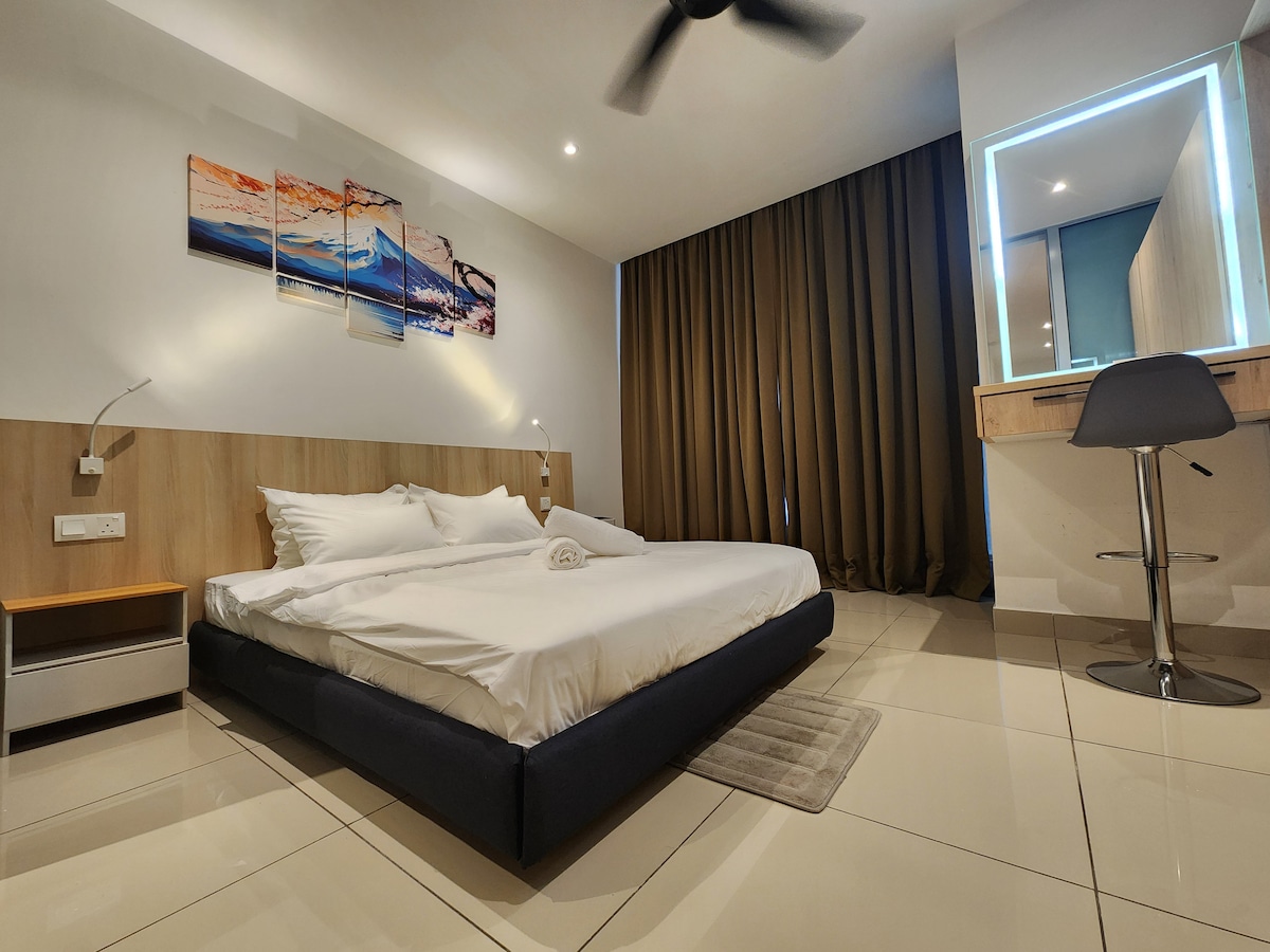 Welcome to your perfect getaway at Conezion! This bright, modern apt offers a tranquil stay with the buzz of IOI City Mall nearby. Wake up to sun-filled rooms and have your morning coffee in a fully equipped kitchen. Step outside and you're just minutes from trendy cafes and shops. Whether you're here for work or a weekend escape, this space offers everything you need: WiFi + Netflix, plush bedding, smart TV, AC rooms, water heater, water purifier, full access to the pool, gym and playroom.