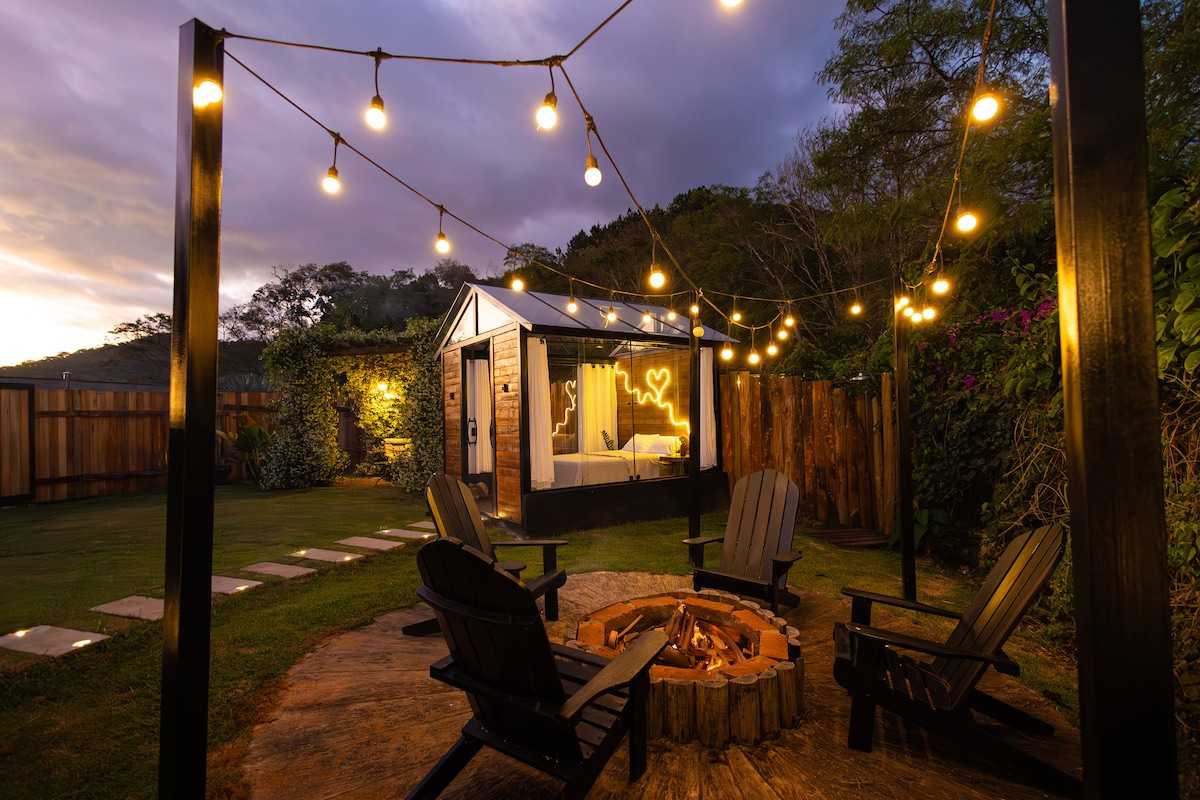 Dining with the whole family in this stylish place. Complimentary Breakfast! The Jacarandá hut has an excellent queen bed for the couple, and a super sofa bed for 2 people also in queen size. Tv 50 “ with many streaming channels, internal fireplace, hydro for 2 people with chromotherapy, full kitchen, large exclusive bathroom. High-quality 500 mbs Internet. Enclosed terrain with security cameras and electronic gate. Pool with mineral water and a wonderful forest.