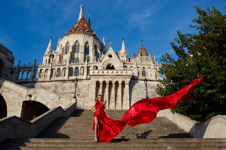 Receive 150 unedited pictures within 24 hours of a photo shoot featuring a bright red flying dress and a personal assistant who helps make the dress fly.