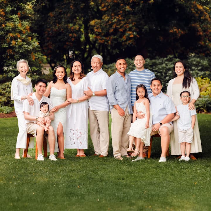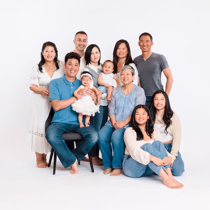 This studio shoot is for families with large groups or multiple generations. Photos are shot on a 10-foot floor-to-ceiling white backdrop for a timeless look. Hosted at a local studio, this package requires 3 weeks in advance to book and is subject to studio availability. The session includes 10 images with retouching.