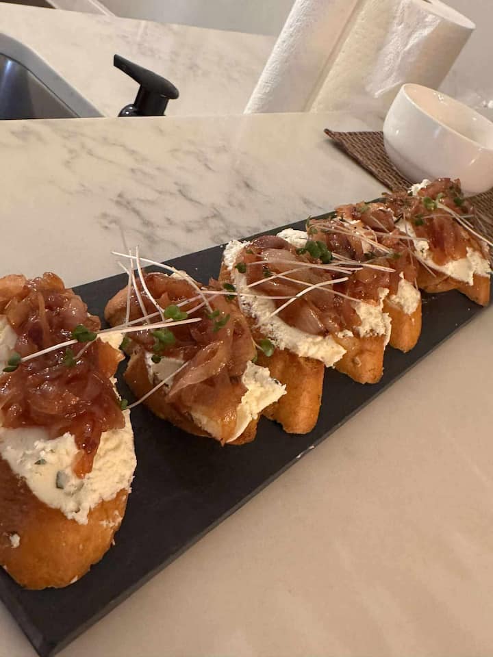 Toasted crostini topped with silky whipped goat cheese brightened with fresh lemon zest, basil, and fresh thyme, finished with slow-caramelized onions folded with sweet cherry jam. Guests participate hands-on in building each element, learning balance, technique, and flavor layering for a dish that is savory, sweet, and beautifully elevated.