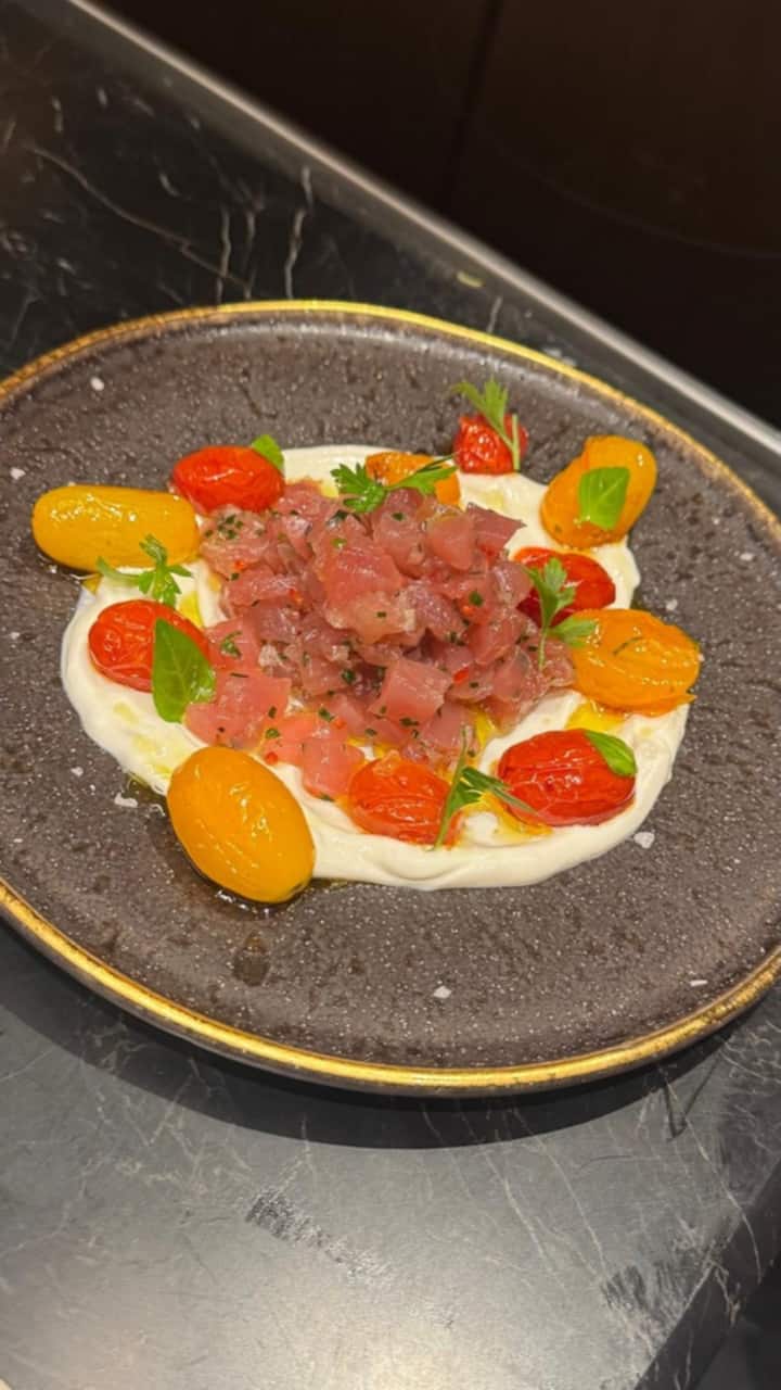 Enjoy a full menu with Paula Cardoso's proposal: a warm Caesar salad with chicken as a starter, followed by a delicate tuna tartare with tomato confit and sour cream. The main course is a pistachio pesto pasta, and to finish, a soft milk pudding.