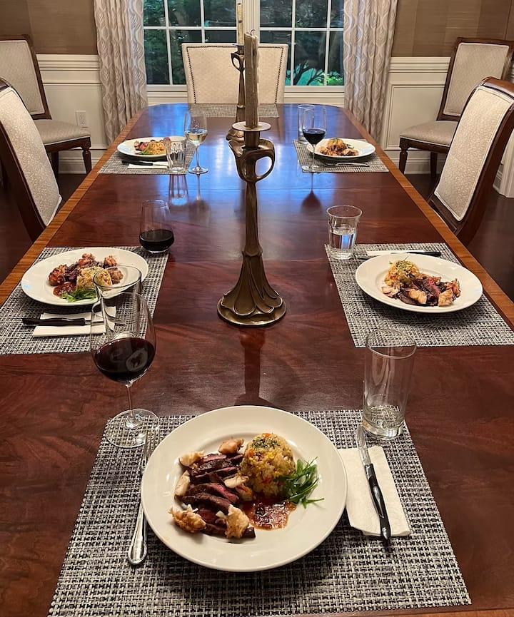 Enjoy a customized, restaurant-quality meal with up to 3 courses in the comfort of an Airbnb or other location. The menu is curated for any occasion, with options for special requests. Groceries can be ordered or shopped for, but are not included in the fee. This is perfect if you want to host a dinner party with ease. Duration of the service may last longer than 4 hours.