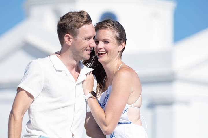 This photo shoot takes place at Paraportiani, Little Venice, windmills, Agia Anna Beach, and Delian columns with studio flash lighting for editorial quality imagery.