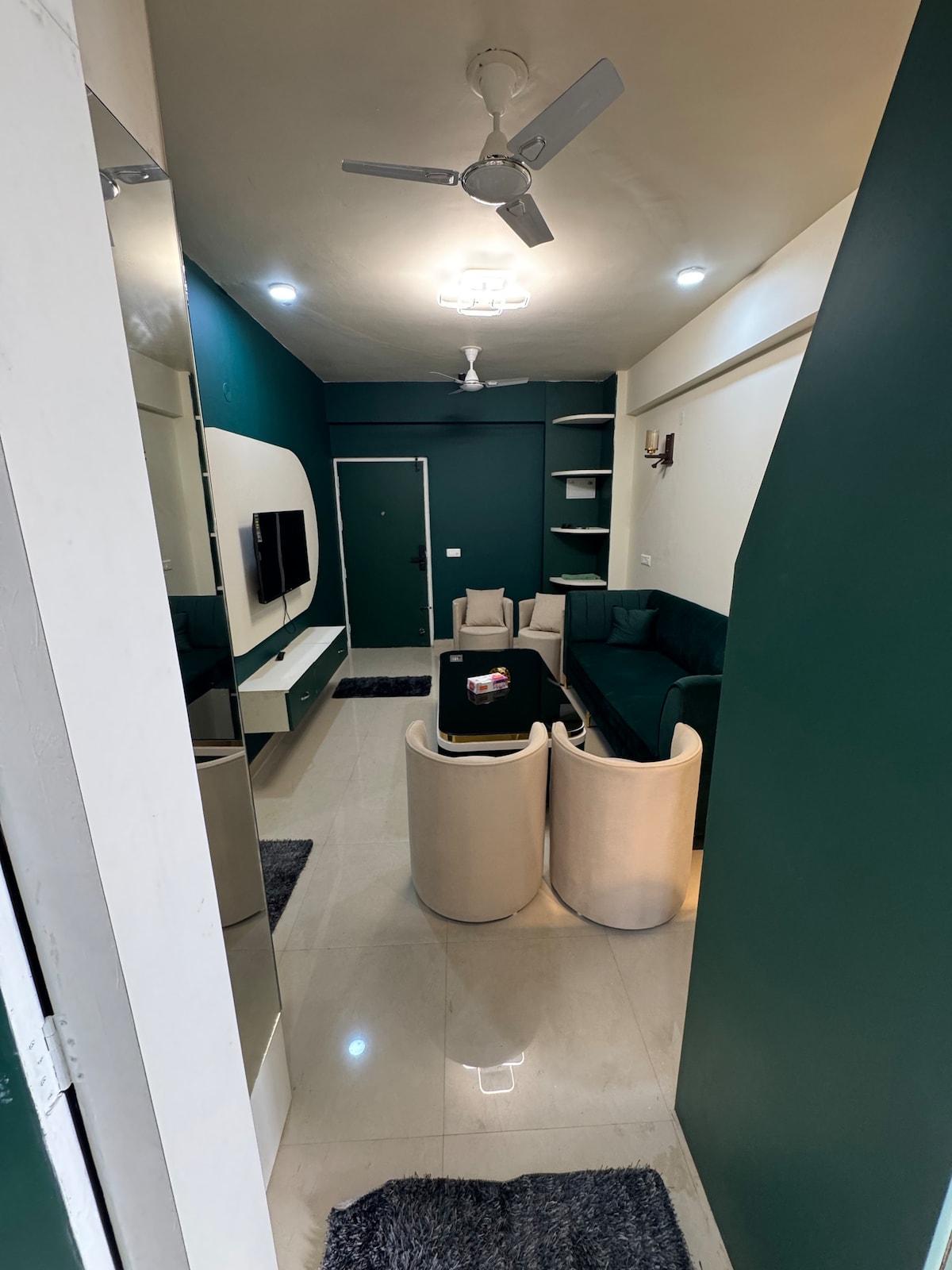 Welcome to The Midnight, your ideal retreat in Karnal! This newly built, couple and family-friendly 2 BHK apartment on the 10th floor of Smart Homes in Sector 32A offers breathtaking views. Each double bedroom features an attached bathroom and private balcony. The elegant living area includes a comfortable sofa, flat-screen TV, and dining space. A fully equipped kitchen with refrigerator and RO water purifier is provided, along with amenities like a geyser, lift access, and 24/7 water supply .